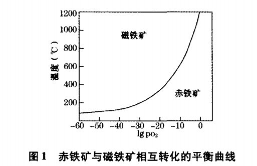 該礦礦石中含有赤鐵礦、磁鐵礦、褐鐵礦,它們之間在一定條件下可以互相轉化。在氧化帶里,赤鐵礦可以由褐鐵礦或纖鐵礦、針鐵礦經脫水作用形成,但又可水化變成針鐵礦,水赤鐵礦等,在還原的條件下,赤鐵礦可轉變為假象磁鐵礦,磁鐵礦受氧化可轉變為假象赤鐵礦,如部分轉變,稱假磁赤鐵礦。磁赤鐵礦具有磁性,是磁鐵礦氧化轉變為γ-Fe2O3的結果。在自然界磁鐵礦和赤鐵礦之間的相互轉化在一定條件下能達到平穩(見圖1)。