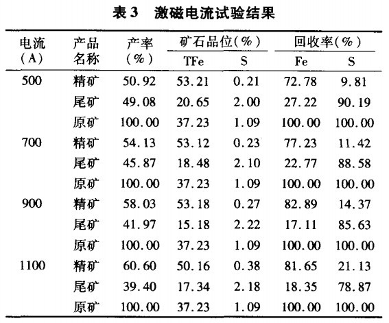 從表3結果可見,激磁電流從500A增加到900A時,精礦鐵品位和回收率都隨之增加,硫的品位降低。但當激磁電流達到900A以后,繼續增大激磁電流。鐵精礦回收率增加,但品位卻隨之下降,而且鐵精礦中硫的品位大于0.3%,所以綜合考慮,選礦試驗采用900A比較合適。