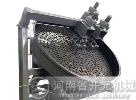 圓盤造粒機是有機肥行業(yè)的常用設(shè)備之一,一般適用于中、低濃度,小規(guī)模的生產(chǎn),成球盤調(diào)整到40°-55°之間。由電機減速機帶動齒輪從而加入混配好的原料肥。由于粉肥和圓盤旋轉(zhuǎn)而上升,又在重力的作用下向下滾動,在以上幾種力的作用下,盤內(nèi)物料逐漸形成基核直至達(dá)到成品顆粒,由圓盤邊溢出。本機具有成球率高、顆粒圓潤、強度大、防腐、操作直觀、維修方便等特點。