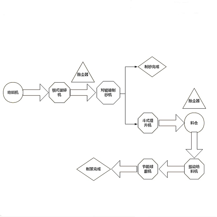 針對李總的煤矸石原料大小(200mm),以及時產量的要求(100T),我們為其設計了煤矸石制砂方案,需要使用到的設備有給料機、顎式破碎機、對輥制砂機等。另外李總還提到在煤矸石制砂完成后想進一步將其制作成漿,需要使用到的后續設備有斗式提升機、料倉、振動給料機、節能球磨機等。大家都知道石料在制砂過程中難免會產生大量灰塵,而國家對生產時的環保有一定的標準,因此我們在整個生產線當中配備了兩臺除塵器,以實現綠色環保生產。具體工藝流程如下:
